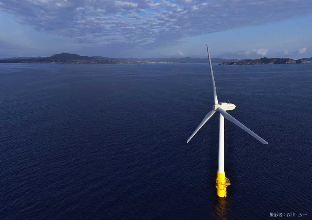 平成27年度(2015年度)に椛島沖での2年間の実証運転を終え、約10km離れた五島市福江島にある崎山沖約5kmの洋上に移動しました。平成27年度(2015年度)の事業終了後は、五島市再生可能エネルギー基本構想のもと、浮体式洋上風力発電の普及促進を目指し、五島市と、当社の100%子会社である五島フローティングウィンドパワー合同会社が共同で、「崎山沖2MW浮体式洋上風力発電所 (はえんかぜ) 」として民間事業による実用化を実現し、現在も運転を継続しています。