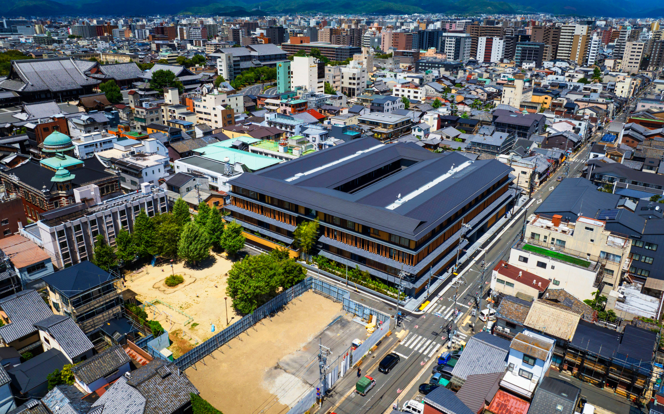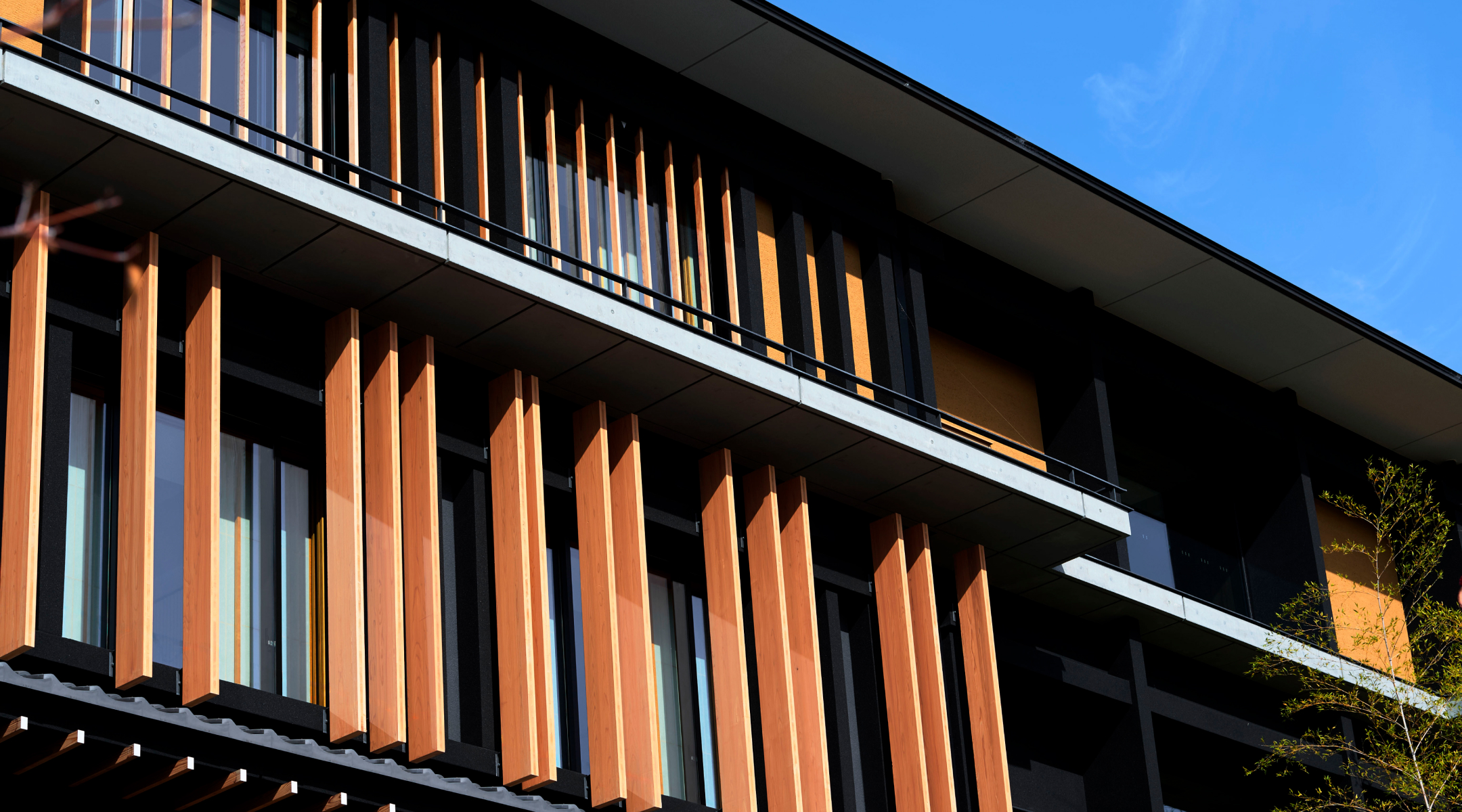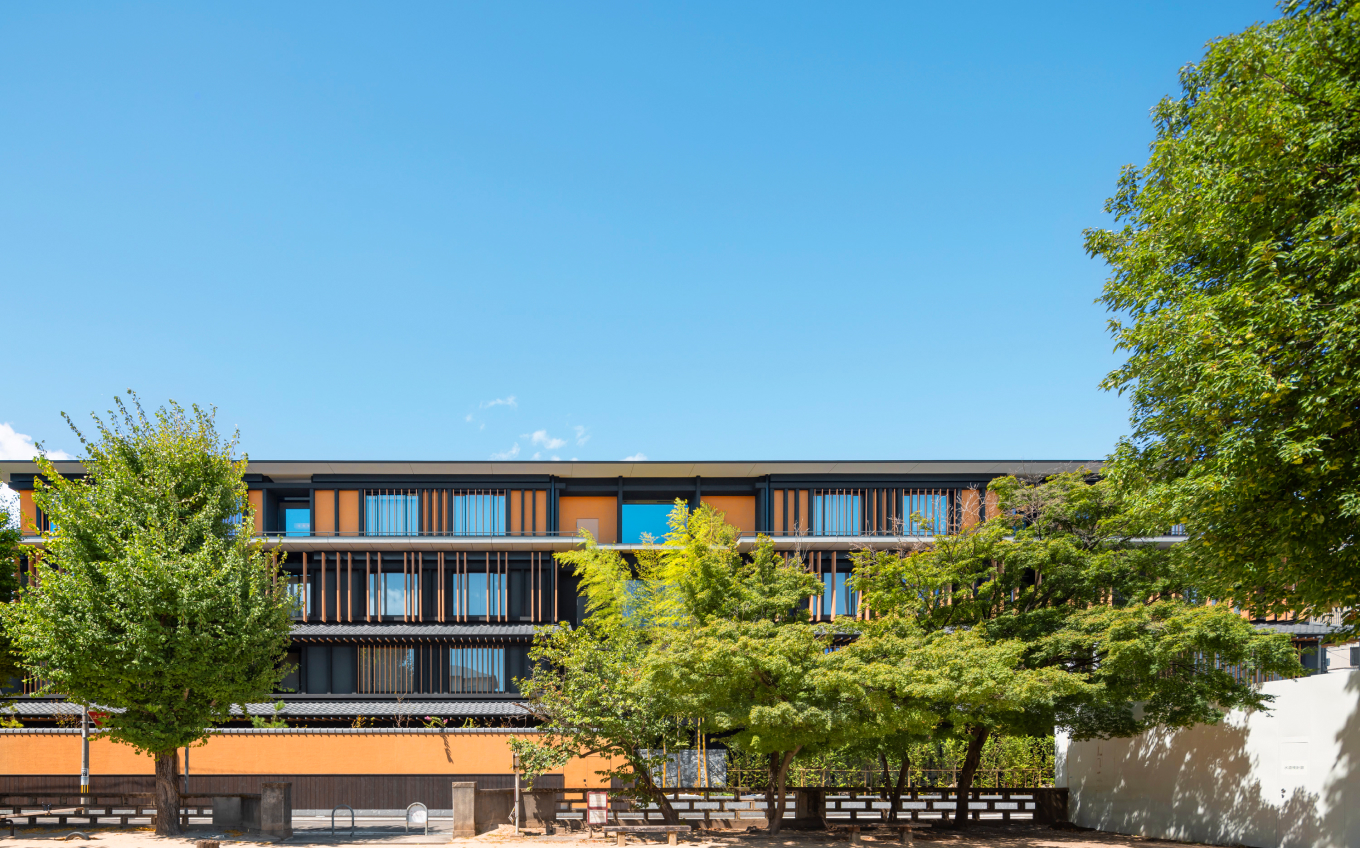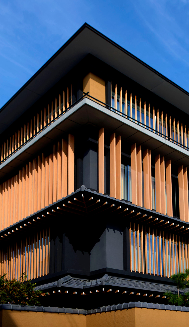 敷地は世界文化遺産でもある西本願寺の門前町。南側の公園の近くには重要文化財でもある茶室・藪内燕庵もあり、京都の玄関口とも言える場所です。そのような場所に建つ「デュシタニ京都・植柳コミュニティセンター」の設計で大切にしたことは、まず第一に、歴史を継承し、町並みに馴染む建物であること。外壁には地域の木材を多用し、色彩に関しても景観条例に沿って、この場所にふさわしいデザインを考えていきました。