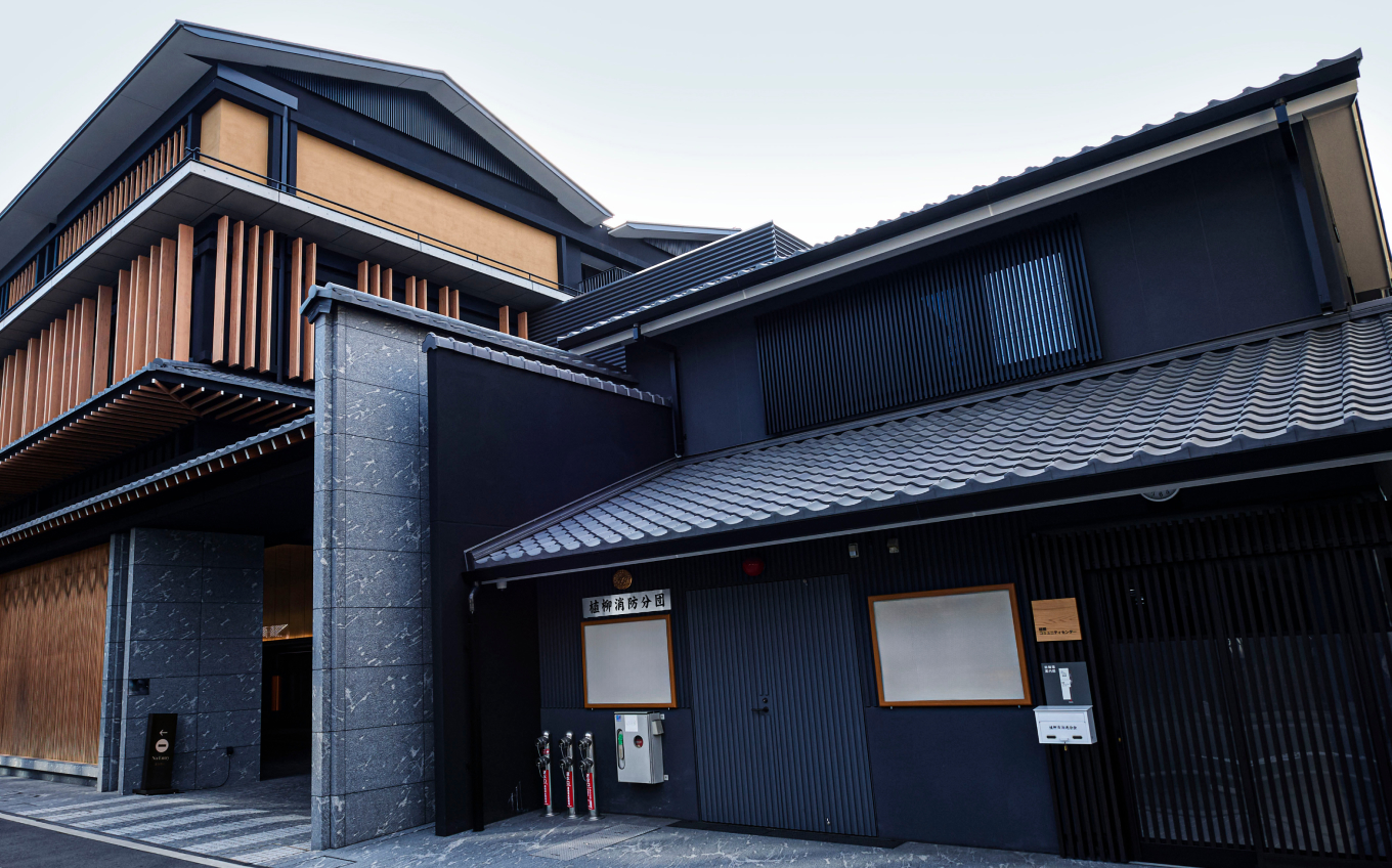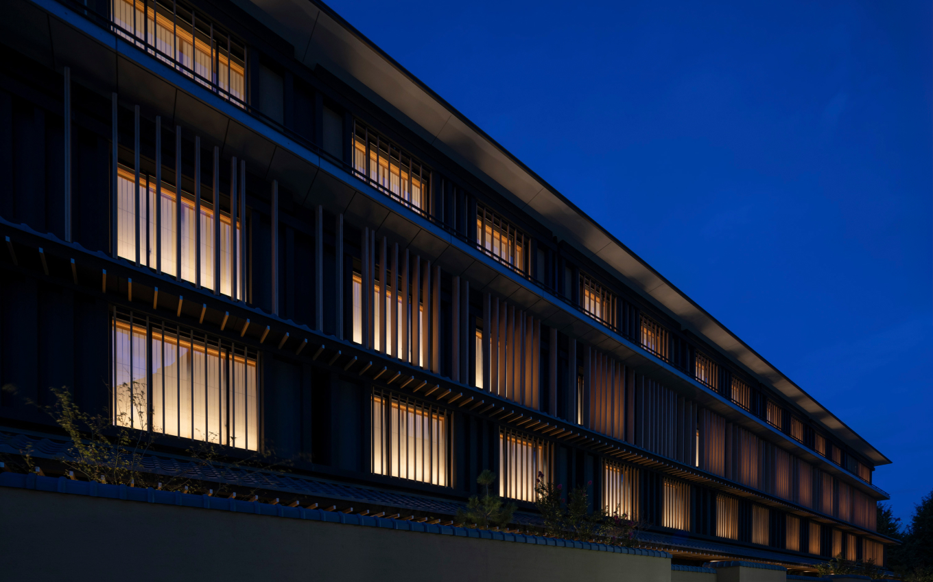 夜になると木格子のルーバーデザインが一際引き立ち京都らしさを演出