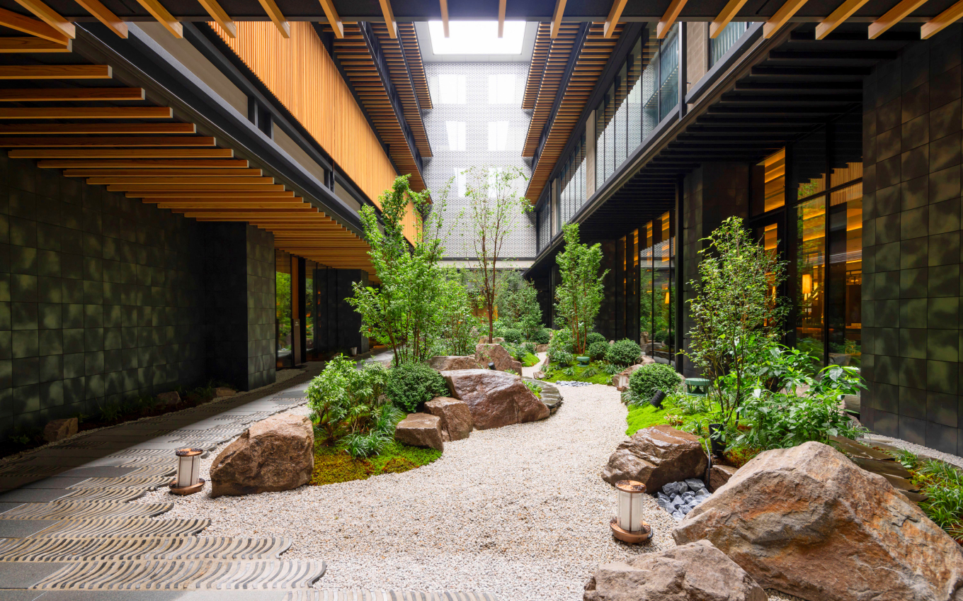 実は、建物の配置は元々の小学校の昭和初期の校舎配置に倣っています。真ん中に校庭があり、その周りを木造校舎がぐるりと囲っていたんです。今回の建物では、かつて校庭のあった場所を中庭に見立て、地下でありながら明るく開放的な空間としています。中庭の両サイドにホテルのレストランがあるのですが、近隣の方々もランチなどでよく利用してくださっていると聞いていますので、地域の方々にも親しみをもっていただけていれば、幸いです。