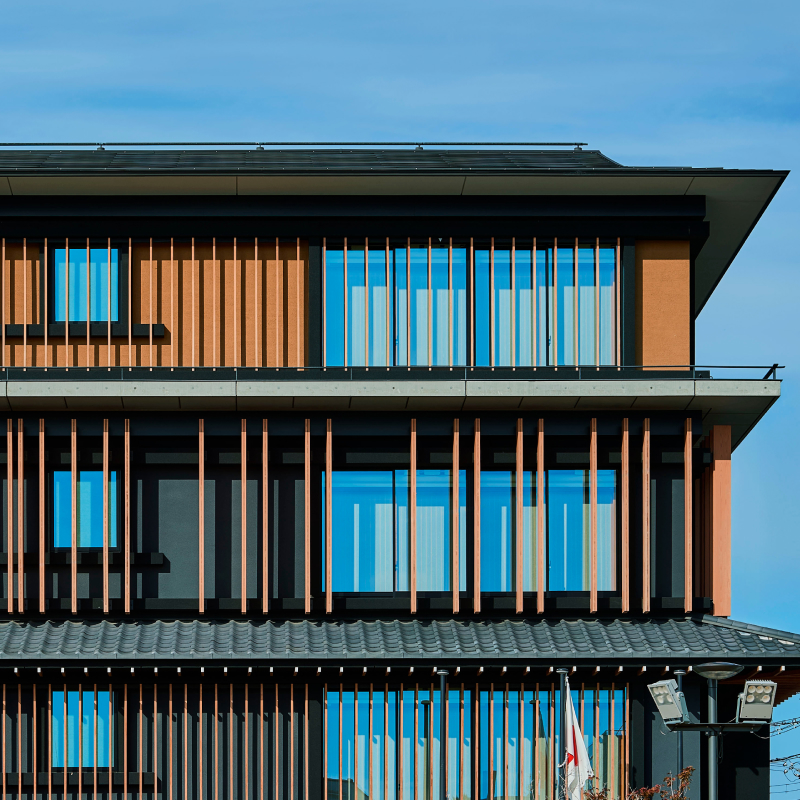 外観の特徴的なルーバーは、京町家で昔から用いられてきた格子をイメージしています。建物の3面が道幅の狭い道路に面しており、近隣住宅とホテルの窓からの視線制御をどうするのかも今回の設計の課題のひとつ。各階の客室側から近隣の窓がどのように見えるかのシミュレーションを何パターンもつくり、住民の方々のご意向をうかがいつつ各方角、各階ごとに格子の太さやピッチを変えています。結果的にその不均一さが建物の個性となり、好評をいただいています。