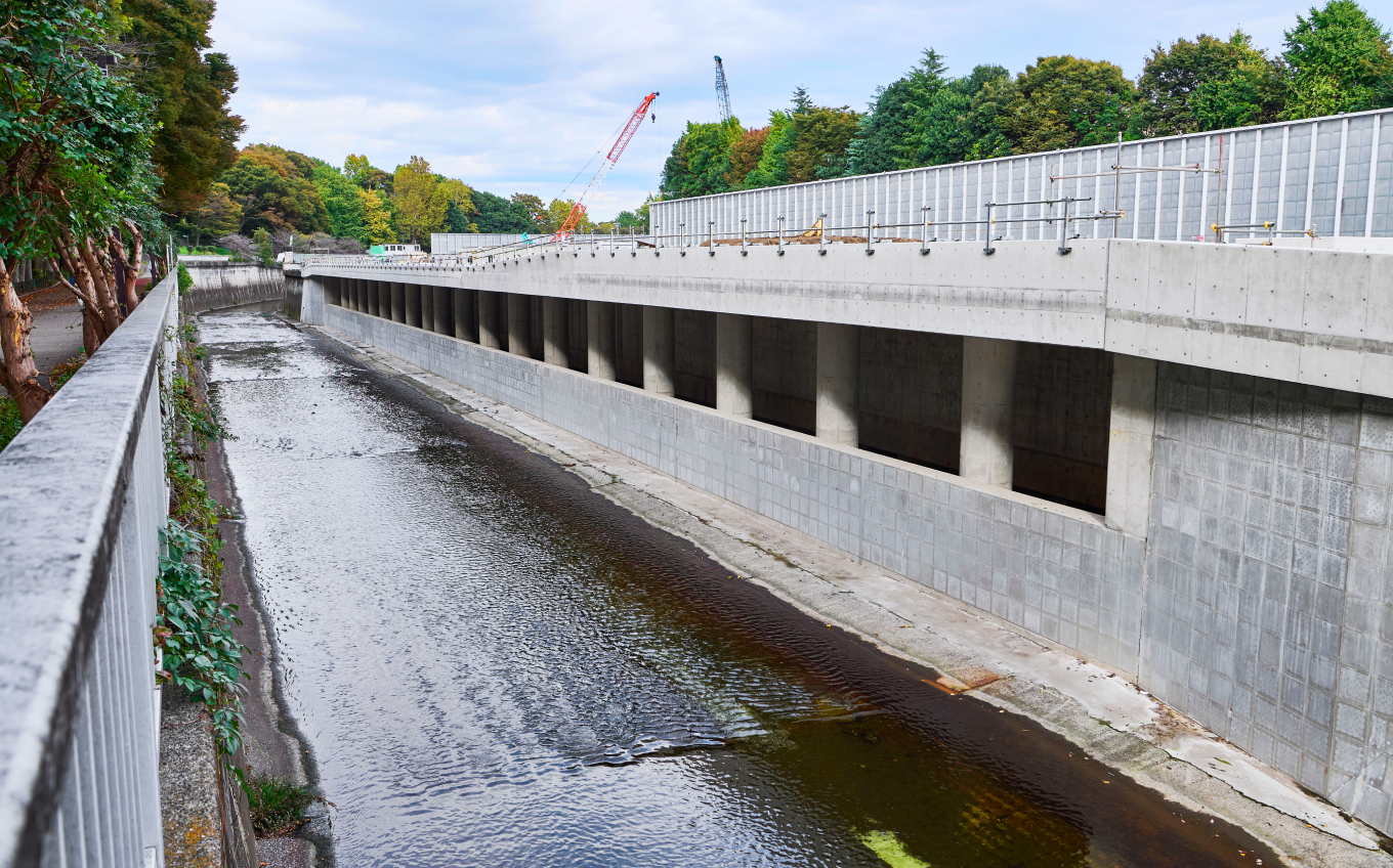 石神井川が増水すると取水口から水を取り込んで水害を軽減。奥では二期工事が始まっている
