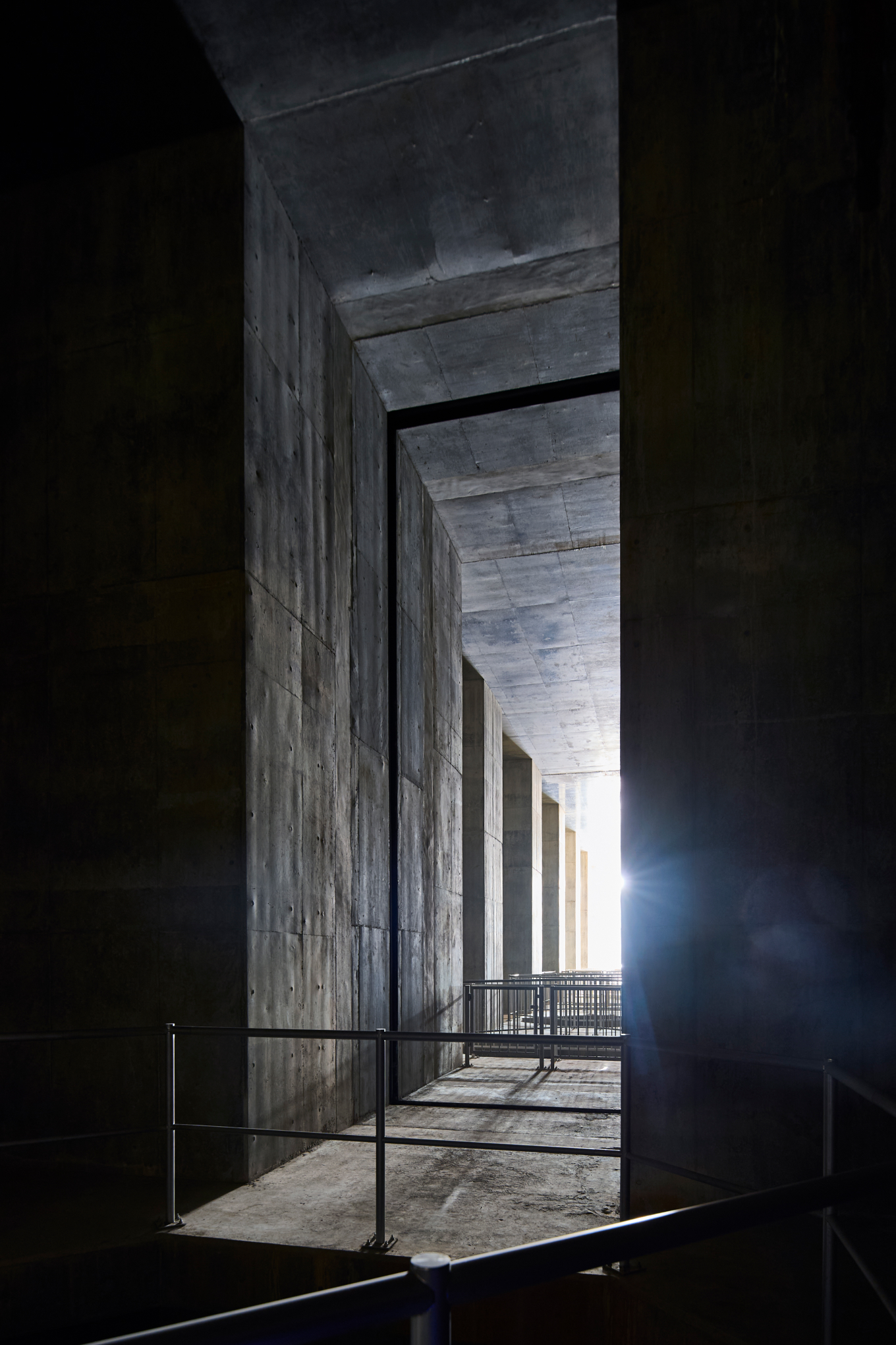 取水口内部の空間。越流堤(斜面)を越えた水は、右側のスクリーンで流木等の侵入を防止し、調節池内部に取り込まれる