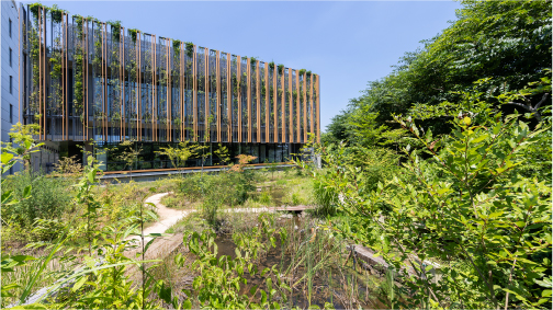 つくば市周辺の水田や樹林地などから採取・調達した、地域由来の在来植物のみで構成したビオトープです。生物多様性の保全に寄与するとともに、この地域ならではの景観の形成を目指しています。